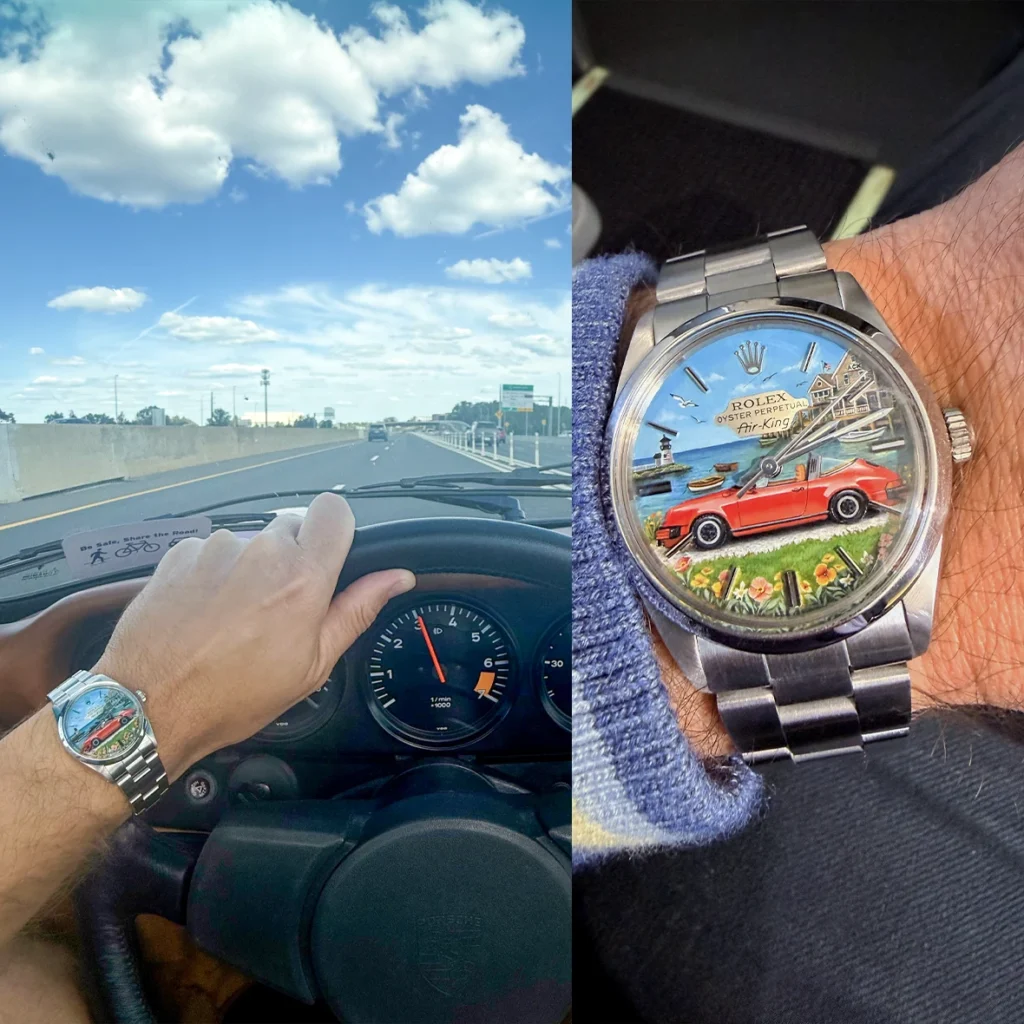 Our hand-painted dials are original artworks custom-created on our clients’ personal watches. We are an independent art studio and are not affiliated with any watch brands; therefore, all logos are concealed for legal purposes. The timepieces shown are purely examples of our craftsmanship and are not for sale. Please visit this page for detailed information and pricing.
