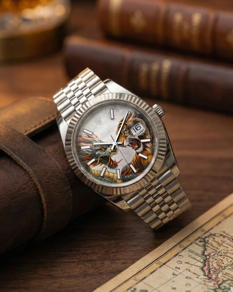 This piece features our hand-painted Dragon and Tiger design on a Rolex dial, commissioned as a bespoke gift to symbolise two sons and the unique bond they share.