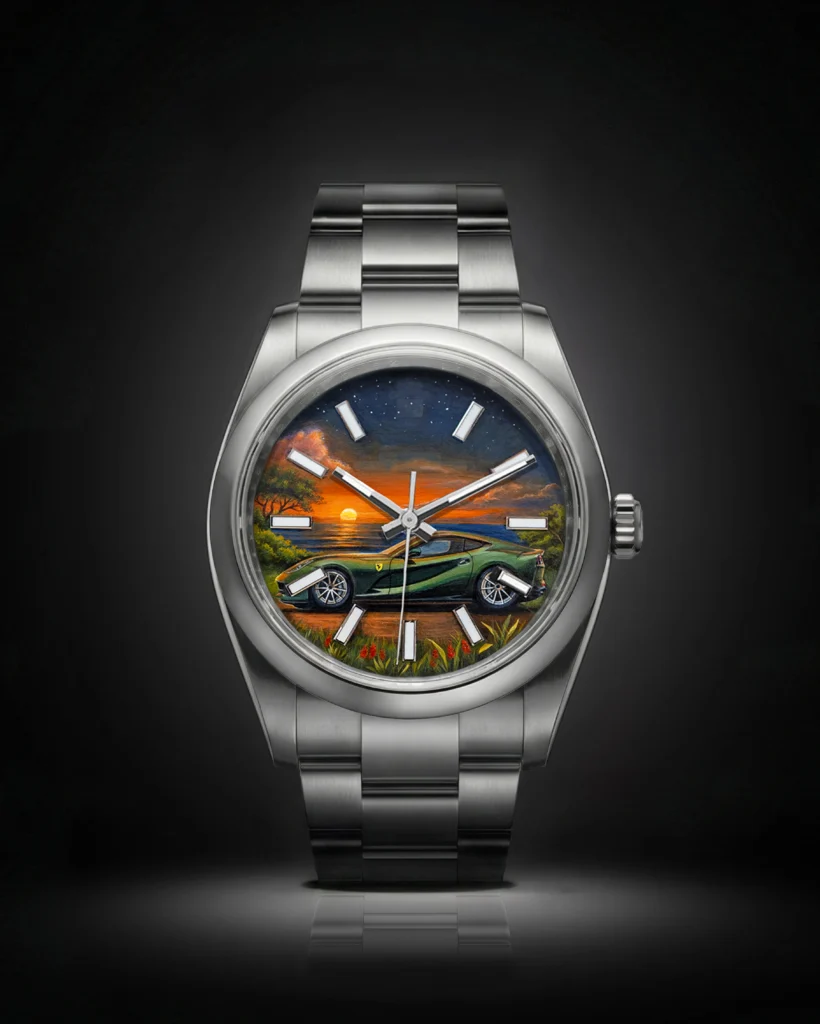 This piece features a hand-painted design inspired by the Ferrari 812, set against a glowing sunset landscape meticulously painted on a customer’s dial with exceptional precision and craftsmanship. The design was specially commissioned by our client to reflect their personal passion for Ferrari and the timeless beauty of golden-hour light.